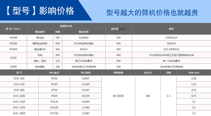 超聲波篩分機型號有:DHC-400、DHC-600、DHC-800、DHC-1000、DHC-1200、DHC-1500、DHC-1800、DHC-2000等八種標(biāo)準(zhǔn)直徑型號;不同型號的超聲波篩分機的價格就是不同,其中影響型號的的因素有:篩網(wǎng)(1—5層)、材質(zhì)(不銹鋼、碳鋼)、振動電機(功率不同)等。