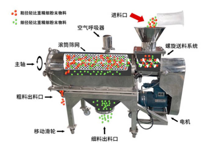 氣流篩分機:主體為立式密閉圓筒篩箱,中心裝有高速旋轉的轉子(風輪)。篩網呈圓筒狀嵌于箱體內壁。工作時,風機產生的氣流攜帶物料,在轉子作用下使細粉穿透篩網,粗粉被分離。通常配有旋風分離器實現氣固分離。