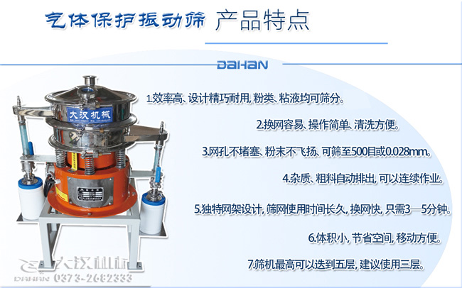 氣體保護篩分機是針對某些物料的特性加裝的,比如有些物料不能接觸氧氣,二氧化碳等等,氣體保護篩分機效率高,設計精巧耐用,網孔不堵塞、粉末不飛揚,雜質、粗料自動排出,可連續(xù)作業(yè)。效率高、設計精巧耐用,粉類、粘液均可篩分。