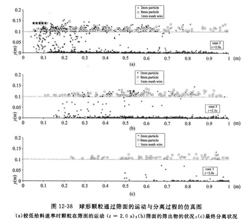 DEM仿真的過程信息能夠在線不同篩分工作條件下顆粒再篩面的運(yùn)動、顆粒同篩面之間的碰撞過程、顆粒通過篩網(wǎng)的分離過程,反映了不同力度顆粒在篩面上運(yùn)動形態(tài)的差異,再現(xiàn)不同振動篩分機(jī)工作條件下顆粒運(yùn)動過程,較為真實(shí)的描述顆粒同篩面之間的碰撞過程。圖12-38為Li等人模擬2mm和8mm球形顆粒通過篩面的運(yùn)動與分離過程圖。